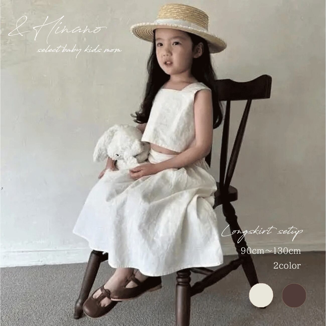 送料無料 2カラー キッズ ロングスカート セットアップ 韓国子供服 90cm~130cm 90 100 110 120 130 ブラウス ノースリーブ キャミソール ロング丈 サマー 春 夏 秋 セット 上下セット コーデ ナチュラル ブラウン 茶色 クリーミーホワイト 白 女の子