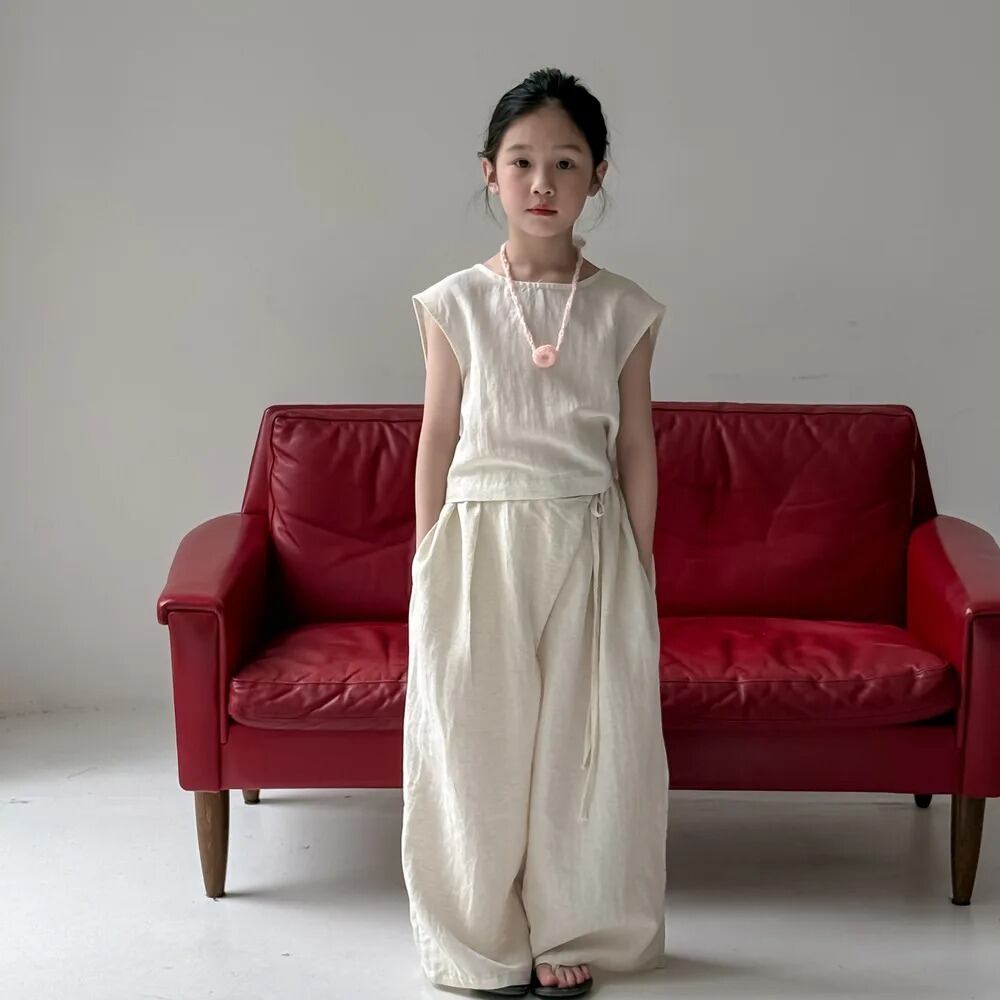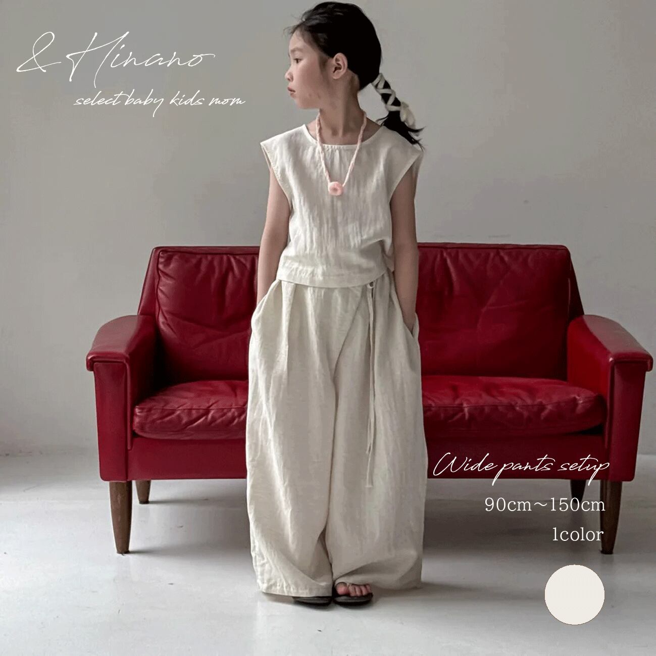 送料無料 キッズ ワイドパンツセットアップ 韓国子供服 90cm~150cm 90 100 110 120 130 140 150 女の子 ジュニア ノースリーブ ブラウス パンツ セット 上下セット 2点セット ワイド シルエット 大人 大人っぽい リゾート こなれ感 サマー 夏