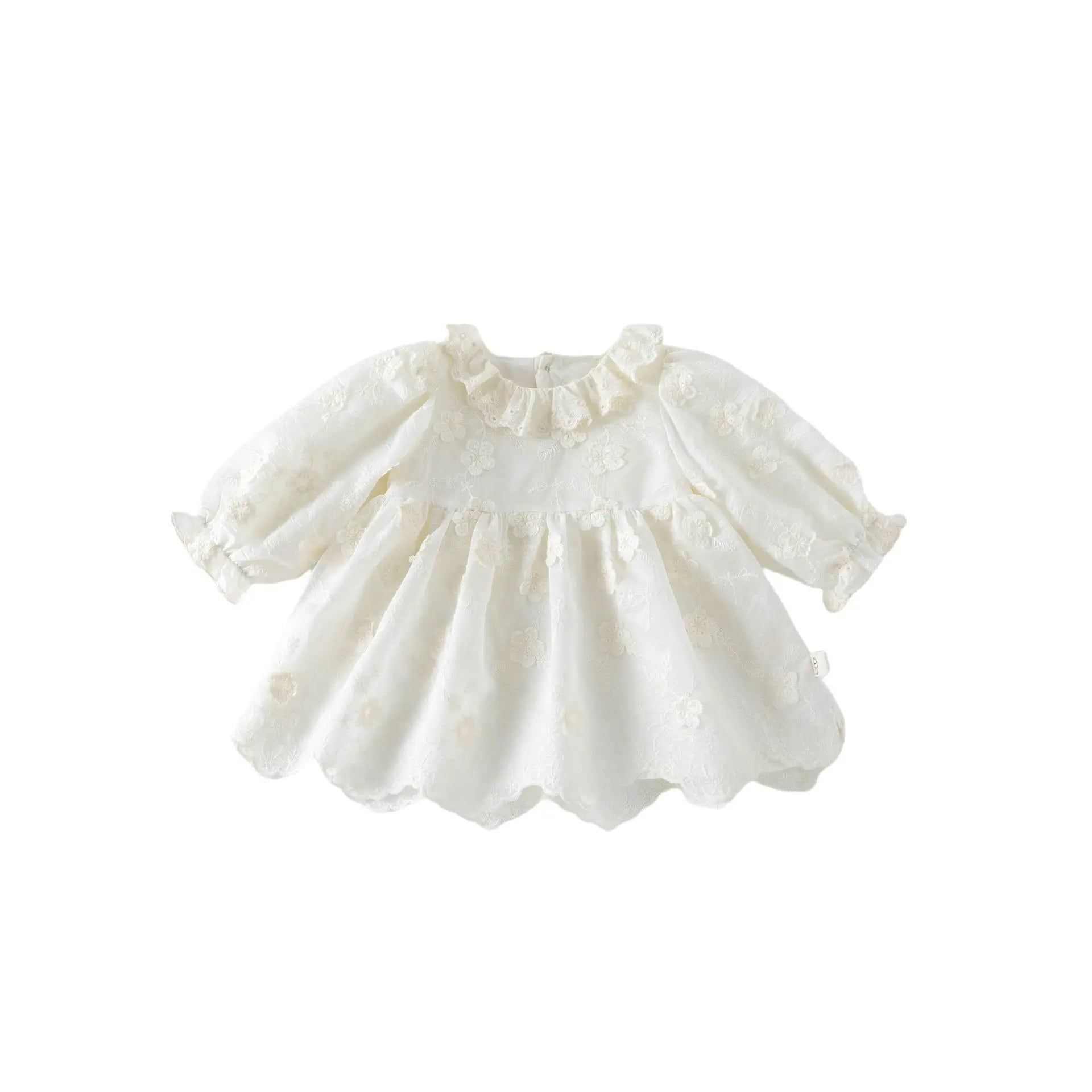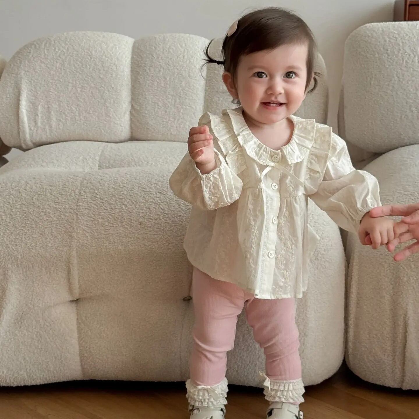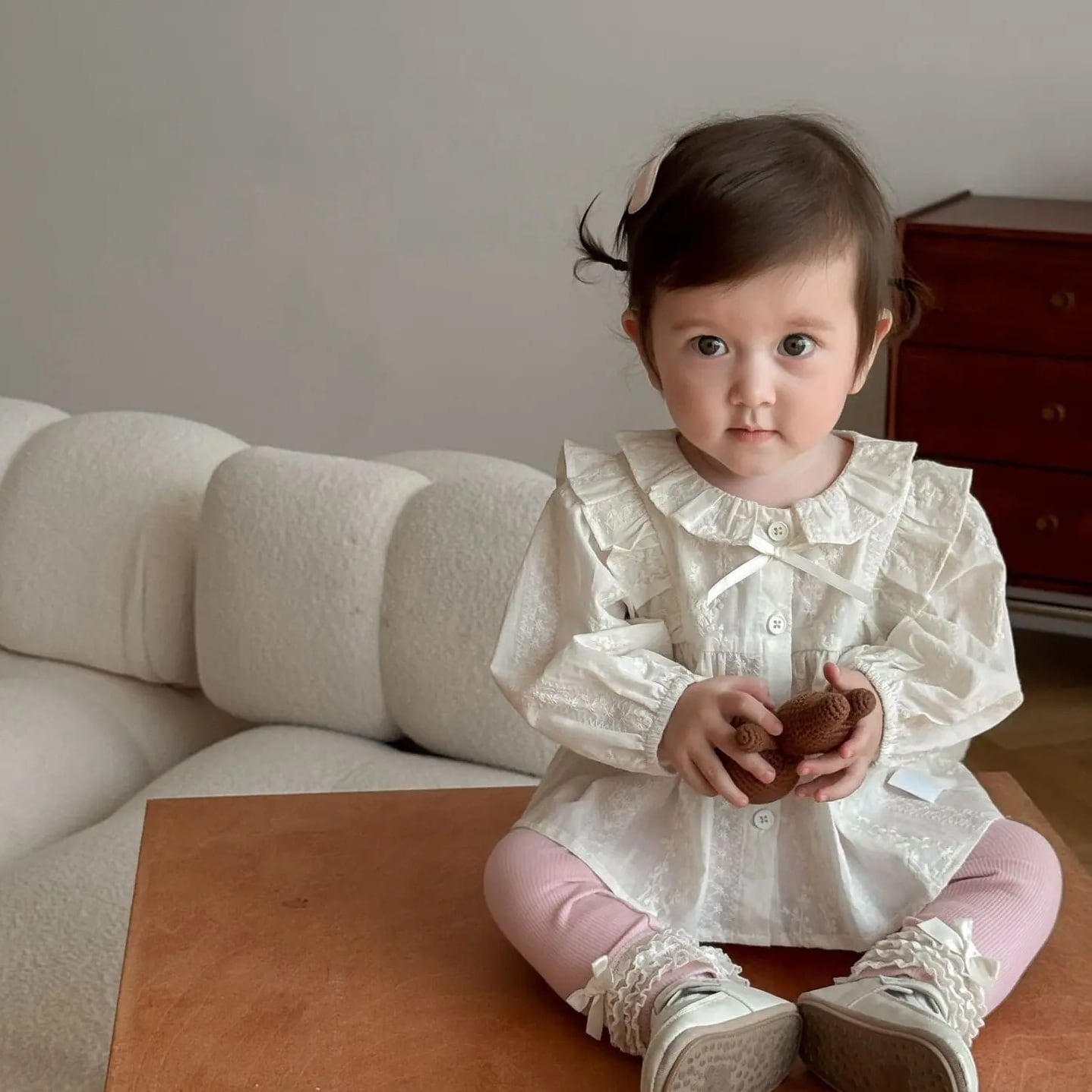 送料無料 ベビー キッズ レースフリルブラウス 韓国子供服 73cm~120cm 秋 春 夏 女の子 シャツ ブラウス トップス 長袖 薄手 刺繍 リボン レース 上品 可愛い かわいい おしゃれ ボタン ゴム袖 お花 フラワー フローラル 花柄