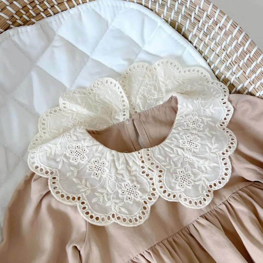 送料無料 ベビー キッズ レースワンピース 韓国子供服 73cm~120cm 70 80 90 100 110 120 秋 春 レース襟 レース袖 刺繍 ギャザー ワンピ ドレス 女の子 花柄 フラワー フローラル ナチュラル カーキ ベージュ 淡色 コーデ コーディネート