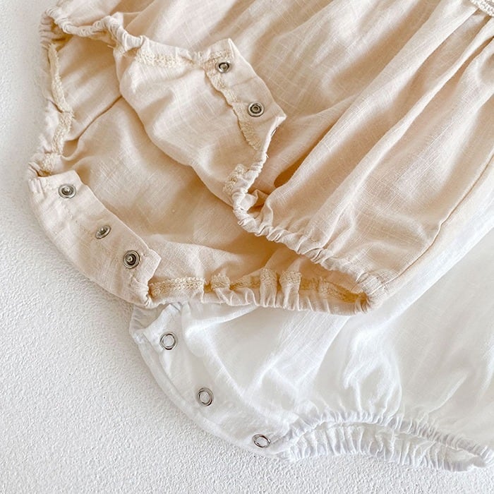 胸元のレースとシアースリーブがとってもかわいいロンパース。春夏のお出かけや撮影にぴったりの一着です。