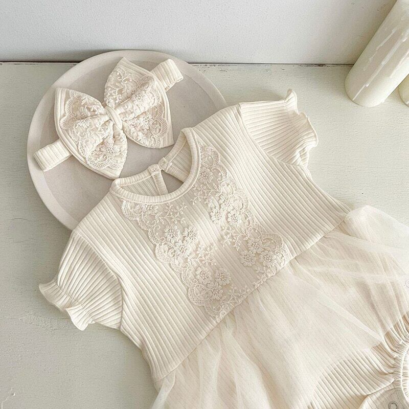 送料無料 キッズ ベビー レース チュール ワンピース風ロンパース レースヘアアクセサリー付き 韓国子供服 66cm~90cm