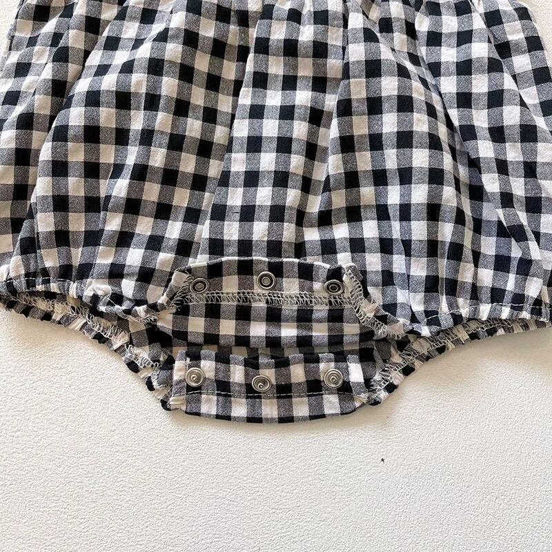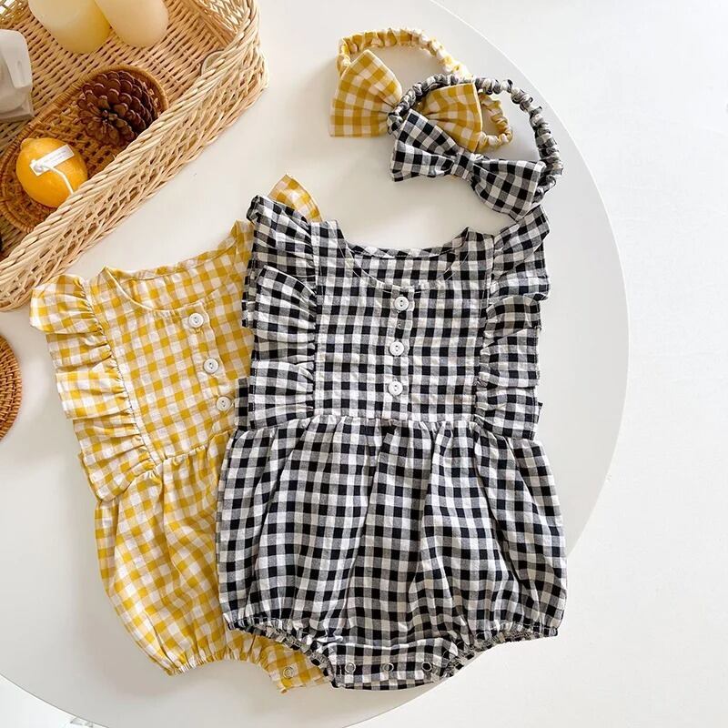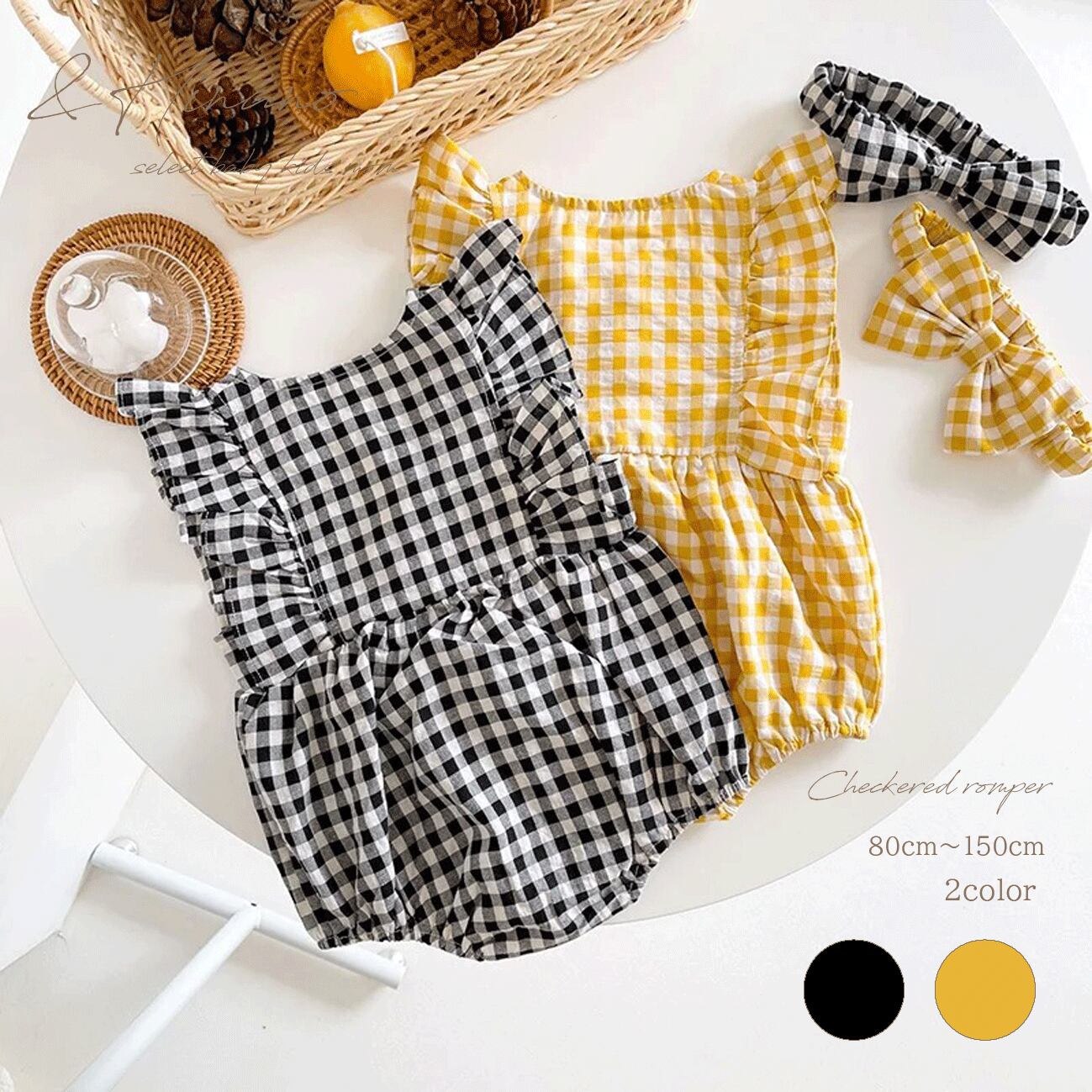 夏にかわいいチェックフリルロンパース。ヘアバンド付きで写真映え間違いなしです