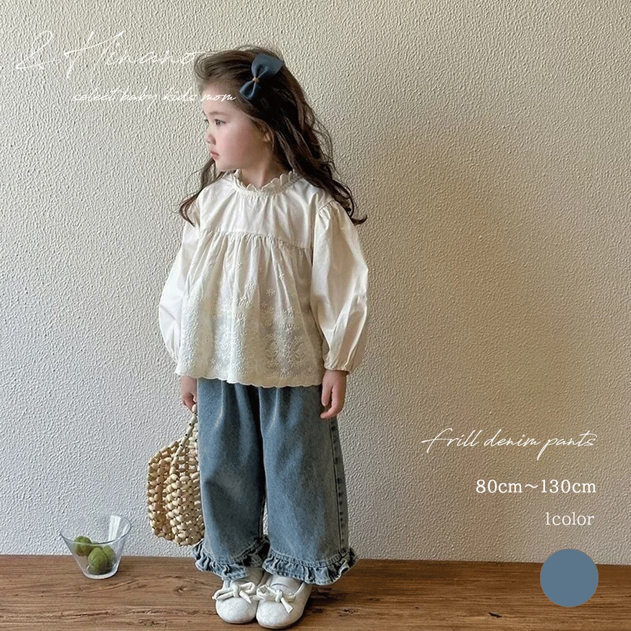 送料無料 キッズ フリルデニムパンツ 韓国子供服 80cm~130cm 80 90 100 110 120 130 ワイドパンツ デニム ジーパン ジーンズ ロングパンツ 長ズボン 女の子 ベビー 子供 こども 子ども ボトムス ナチュラル ゆったり 春 夏 秋 冬 裾フリル